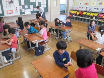 算数の学習です。6はいくつといくつ?を考えました。数図ブロックやおはじきを使い,友達と考えることができました。