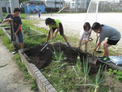 今日の放課後に新たに野菜を植えるために畑を作りました。放課後に残れる人たちが集まってくれ土作りができました。次は明日,畝づくりをして種まきをします。