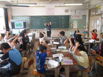 今日は,ALTの先生と一緒に色と形の英語の言い方を習いました。その後,習った言葉を使ってゲームをしました。