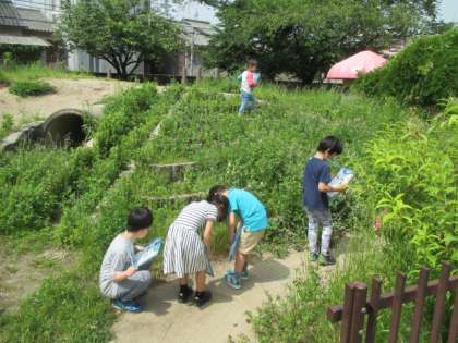 学校に咲いている野花を見つけました。先生が決めた5つの花を見つけるよう指令が出ました。1年生の子どもたちは,すぐに見つけることができました。最後は,からすのえんどう(ピーピー豆)で笛を作りました。なかなか鳴りません。練習する子が出てきそうな予感です。