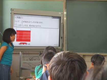 6年生は算数の授業でした。分数のかけ算の単元ですが,とても難しいところです。図にしたり,説明を考えたりして,問題に取り組んでいました。