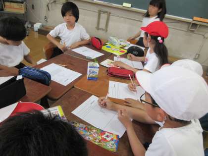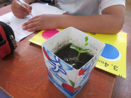 ツルレイシの芽が出たので,みんなで観察・記録しました。