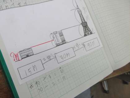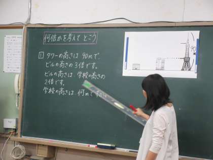 3つの物の大きさを比べながら,どれがどれの何倍になるかを考える学習をしています。