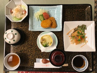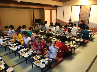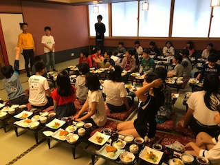 修学旅行の楽しみの一つ,広間での夕食です。味噌カツをはじめ、たっぷりと食べごたえのある美味しい食事でした。修学旅行を楽しんでいるにぎやかな夕食でした。