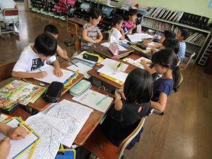 校区探検をして見つけたことを,クラスのみんなと話し合いながらまとめていきます。