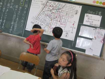 地図を確認しながら,どこにどんなものが多くあったかを確かめています。