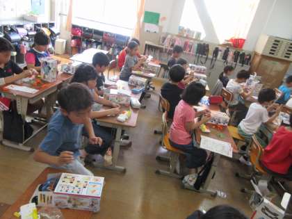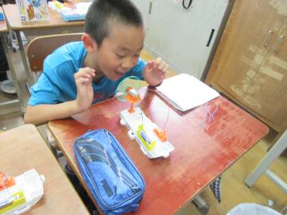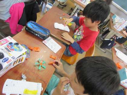 導線のつなぎ方を考え悪戦苦闘していた子ども達ですが,プロペラが回った時は大喜びで笑顔になりました。
