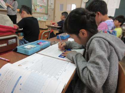 昨日の学習の続きで,表をもとにしながら折れ線グラフを描きました。