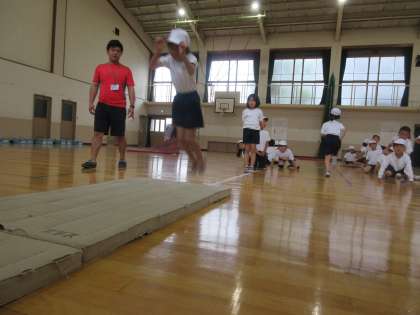助走をつけずに腕の振りと膝のばねだけで幅跳びをします。