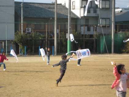 1年生のせいかつかではいま、ふゆのあそびをたのしんでいます。きのうはこままわしをして、きょうはたこあげをしました。じぶんでたこにえをかき、うんどうじょうでげんきいっぱいはしりながらたこをあげました。あしたにもういちどたこあげをするのでたのしみにしておいてください。