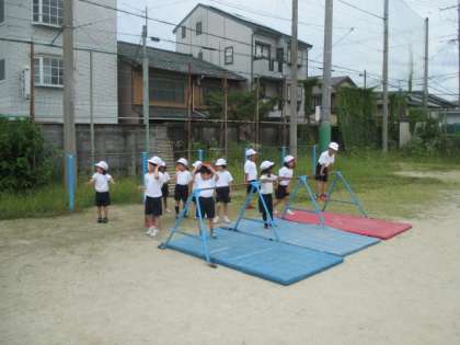 体育の学習です。鉄棒遊びを楽しみました。こうもりや跳び下りなど,自分に合った技に取り組みました。