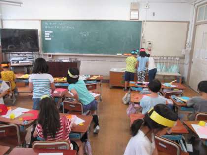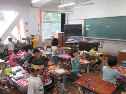 図工の学習です。わっかを頭にかぶり,生き物に変身です。ねこやうさぎなど様々です。発想豊かな2年生です。