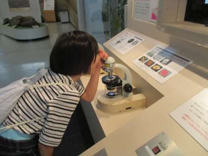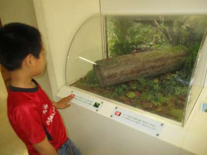 屋内展示では,生きものに触れたり,実験装置を動かしたり,恐竜の化石を見たりしました。楽しい場所がたくさんあって目移りしていました。