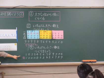 大きな数の大小を比べる方法を考えたり,限られた数字をどう並び変えれば大きな数が作れるかなどを考えました。