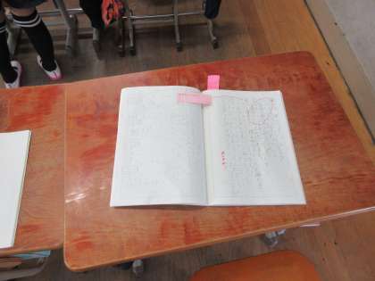 自学ノートをクラスのみんなでお互いに見合う活動をしました。良いなと思ったノートには付箋でコメントを書き込みます。良い所はどんどんマネをしながら,みんなでより良いノート作りを目指します。