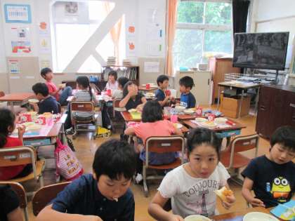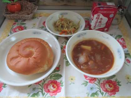 でした。トマトシチューは,トマトの酸味でさっぱりとしていて暑い日にも食べやすいです。もやしのカレーソテーは,カレーの味で食欲がそそられます。もやしのシャキシャキとした食感を楽しんで食べていました。