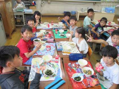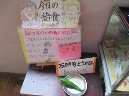 給食室前には,万願寺とうがらしも展示してあり,夏の京野菜を知るいいきっかけになっていました。給食後には「おいしかった!」とたくさん感想をいただきました。