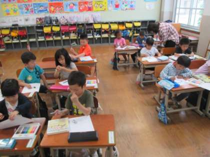 生活科の学習です。ふうせんかずらの観察をしました。黒い種にハートマークがついています。かわいい種なので,種に色をぬりました。