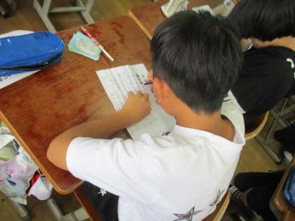 見本を見ながら,ペンで写しています。いつも以上にていねいに字を書くことができました。