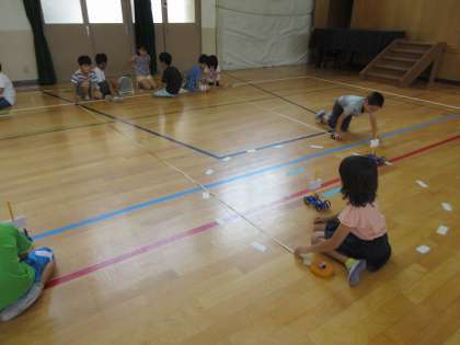 風で動く車を使って実験をしました。