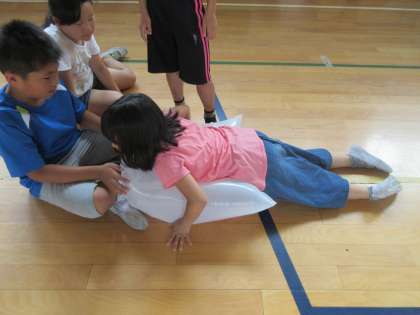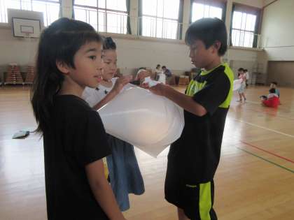 閉じ込めた空気をどのように感じるかの実験をしました。押してみたり,乗ってみたり,色々な手触りを感じることができました。