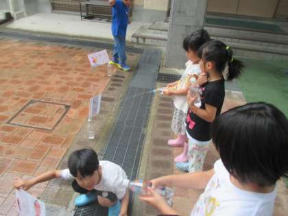 生活科の学習です。前回のように,砂山に旗を立てようとしたのですが,雨です。そこで,ペットボトルに旗をさし,屋根のあるところで,旗倒し大会をしました。大盛り上がりでした。
