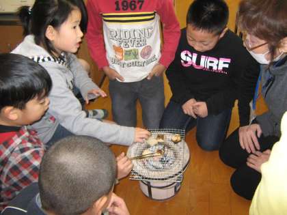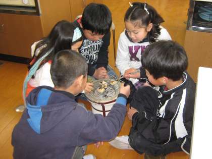 社会科の学習では,むかしの生活体験をしました。七輪(しちりん)や火鉢(ひばち)を使って,おもちを焼きました。コンロで炭をおこし,十能(じゅうのう)ではこびました。「炭ってあたたかい!」「昔の気分になってきた」など色いろな感想が出ていました。おもちは、こんがりやけておいしくいただきました。