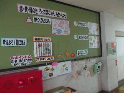 2学期が始まりましたね。給食室前の掲示板も新しくなりました。今月のテーマは,「赤・黄・緑のそろった朝ごはんを食べよう」です。小さなホワイトボードに,自分で考えた朝ごはんを組み合わせることができます。
