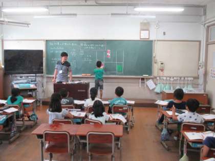 算数の時間です。筆算の計算の仕方を説明しています。黒板の前でみんなに説明できる力ってすごいですね。