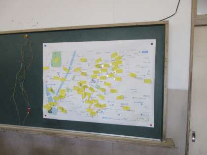 校区の地図を見ながら,事故や事件が起こりそうな所を探しました。街灯が少ない所,信号のない横断歩道など子ども達の視点で安全マップを作り上げることができました。