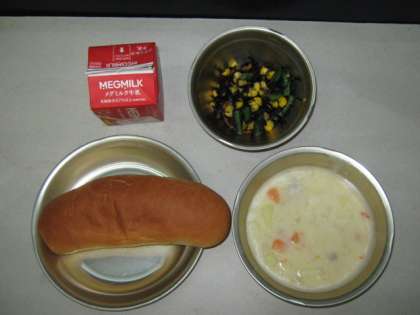 今日の給食は,味付けコッペパン・牛乳・じゃがいものクリームシチュー・ひじきのソティでした。クリームシチューは,ほくほくとしたじゃがいもとホワイトルーの味がよくあって,とろりとした口あたりでおいしかったです。体も温まりました。ひじきのソティは,人参の赤・コーンの黄・三度豆の緑・ひじきの黒といろどりがきれいでした。