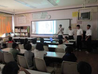 夏休み前に,大雨のため延期になっていた読み聞かせを31日(金)にしていただきました。楽しいお話に小学生はくぎ付けになっていました。読み聞かせの後はクイズもあり,お話をしっかり聞いていた小学生たちは,みんなノリノリで答えていました。終わりには,生徒さん手作りのしおりもいただきました。今日まで練習などありがとうございました。とても楽しい時間を過ごすことができました。