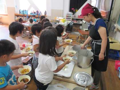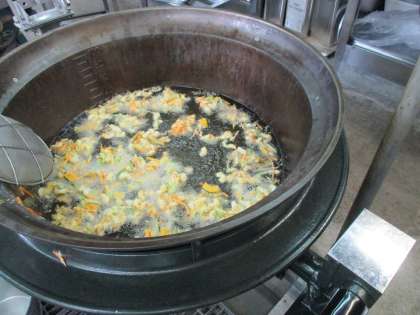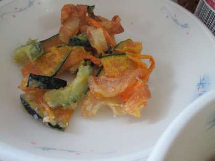 でした。夏野菜のかきあげには,夏野菜のゴーヤとかぼちゃ,その他に,にんじん・ちくわが入っていました。暑い中,調理員さんが丁寧に揚げてくださいました。かぼちゃの甘みとゴーヤの苦みがマッチしていましたね。おかわりする子もたくさんいました。写真は,1年生の様子です。