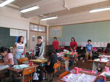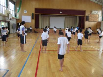 組体操の練習が終わると,教室で自主練習が始まります。映像を映し出し細かな振付けをチェックしながら練習しています。