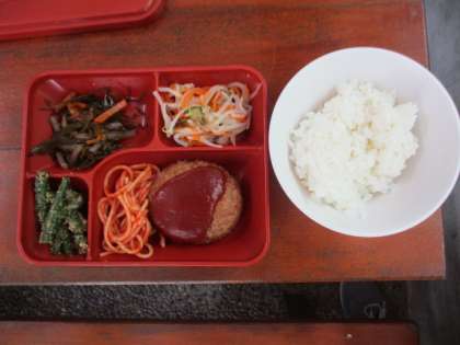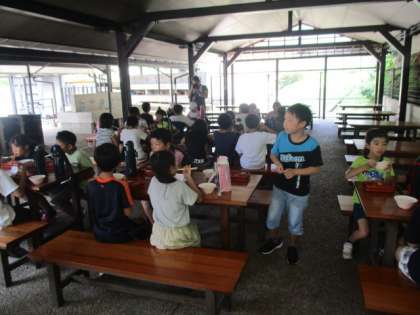 磯観察・プールを存分に楽しみ、体を動かしたせいか、お腹を空かす子どもが多く、昼食もしっかりと食べました。子どもたちの大好きなハンバーグが出ました。