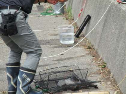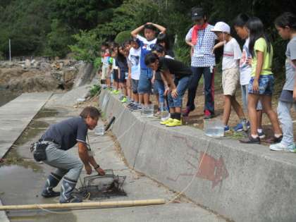 昨日のしかけ(「かご網」というそうです)を引き上げました。子どもたちの願いが強かったのか、たくさんの生き物がかかっていました。かご網を引き上げる度に、歓声が上がりました。