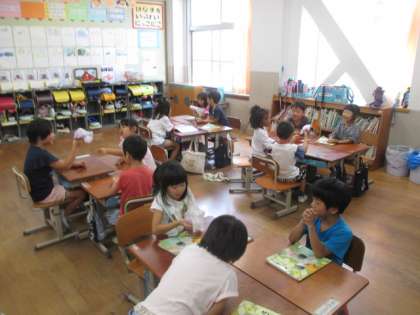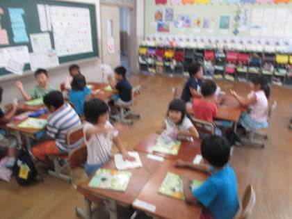 アサガオの花で色水を作りました。ブドウジュースみたい,ワインみたいといった子も。その色水を和紙につけて遊びました。楽しい時間でした。