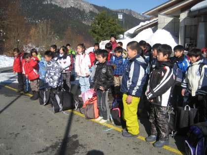 3年生が花脊山の家に1泊2日で出かけました。3年生は初めての宿泊でみんな楽しみにしていました。学校で出発式を行いました。校長先生からは、「あいさつ」と「感謝」をキーワードにというお話がありました。いよいよバスにのって出発です。バスの中では「花脊だホイ」の歌声が・・・近づくにつれて雪がいっぱい。心の中がワクワクしているのがよくわかりました。