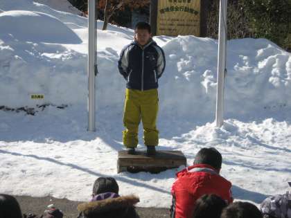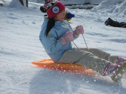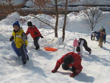 入所式を済ませた後、宿泊棟へ移動。それぞれ宿泊する部屋の場所を確認しました。昼食後、楽しみにしていたソリ遊び。いきよいよく加速するソリにスリル満点、大喜びでした。スピードが怖い子どもは、雪遊びをして楽しみました。空は青空、ポカポカ陽気で気持のよい午後でした。
