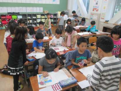 算数の学習です。かけ算の学習,子どもたちは意欲的に取り組んでいます。ブロックを使ったり,図を書いたりして習熟に励んでいます。