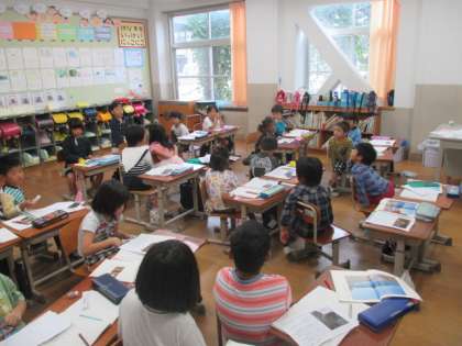 国語の学習です。生き物が敵から逃げるために,身をどのように守るのかを,図鑑を使って調べました。調べたことをカードにして,みんなで読み合いました。