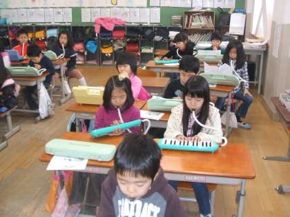 音楽では,けんばんハーモニカの学しゅうをしています。こんかいは『小ぎつね』をえんそうしました。みんなゆびの使い方に気をつけてえんそうをすることができました。