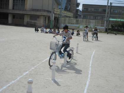 自転車の正しい乗り方について学科・技術のテストを受けました。ジグザグ走行やゆっくり走行など技術的なところで苦戦する子ども達が多かったです。