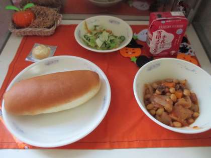 でした。今日のコッペパンは,国産小麦100%でした。コッペパンにチーズをはさんで食べていた子もいました。大豆と牛肉のトマト煮は,牛肉のうまみと玉ねぎのあまみがギュッとつまっていてとってもおいしいです。しっかり食べることができました。