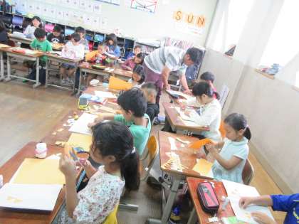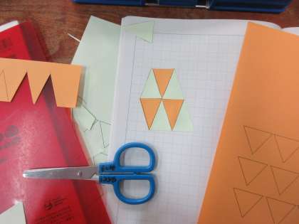 同じ形の二等辺三角形や正三角形を敷き詰める活動をしました。同じ形だと,隙間なく敷き詰めていけることに気がつくことができました。