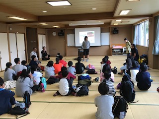 奥越高原青少年自然の家に到着しました。4泊5日お世話になる宿舎です。入所式,オリエンテーションともに,とても立派な態度で臨めました。