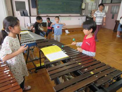担当の楽器も決まり,いよいよ合奏の練習が始まりました。初めてなので,ものすごくテンポをゆっくりにして正しい音が確実に出せるように練習しています。