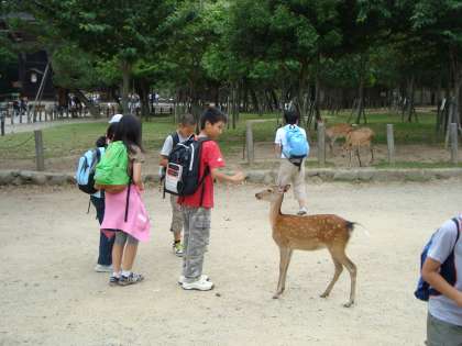 6月8日(月),運動場に原寸大の奈良の大仏を新聞紙や線で作りました。そして9日(火),実際に奈良へ大仏を見に行きました。堂々とした大仏を見て,そのスケールの大きさに言葉を失いました。その後は奈良公園のオリエンテーリング。しかしなんと言っても印象に残ったのはシカとたわむれた弁当タイム。シカの襲来におびえながら食べたお弁当は,子どもたちにとってきっと思い出に残ったことでしょう。