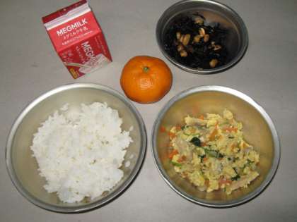 今日の給食は,ごはん・牛乳・親子煮・ひじき豆・みかんでした。今日の親子煮には,三つ葉が入っていました。いろどりがきれいで,とてもおいしそうに仕上がりました。デザートにみかんがつきました。デザートがあるとうれしいです。