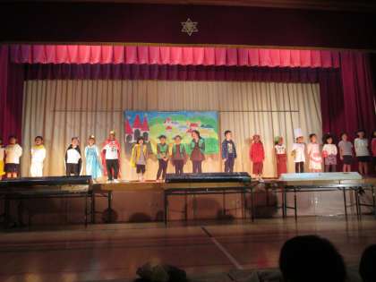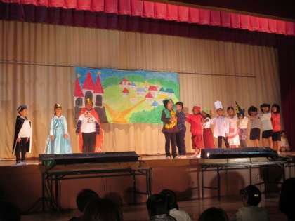 1年生は「金のガチョウ」のげきをしました。ふしぎな金のガチョウに人々がどんどんつながって,大行列になるお話です。体育館の後ろまで聞こえる大きな声で,動きもつけて上手に発表することができました。